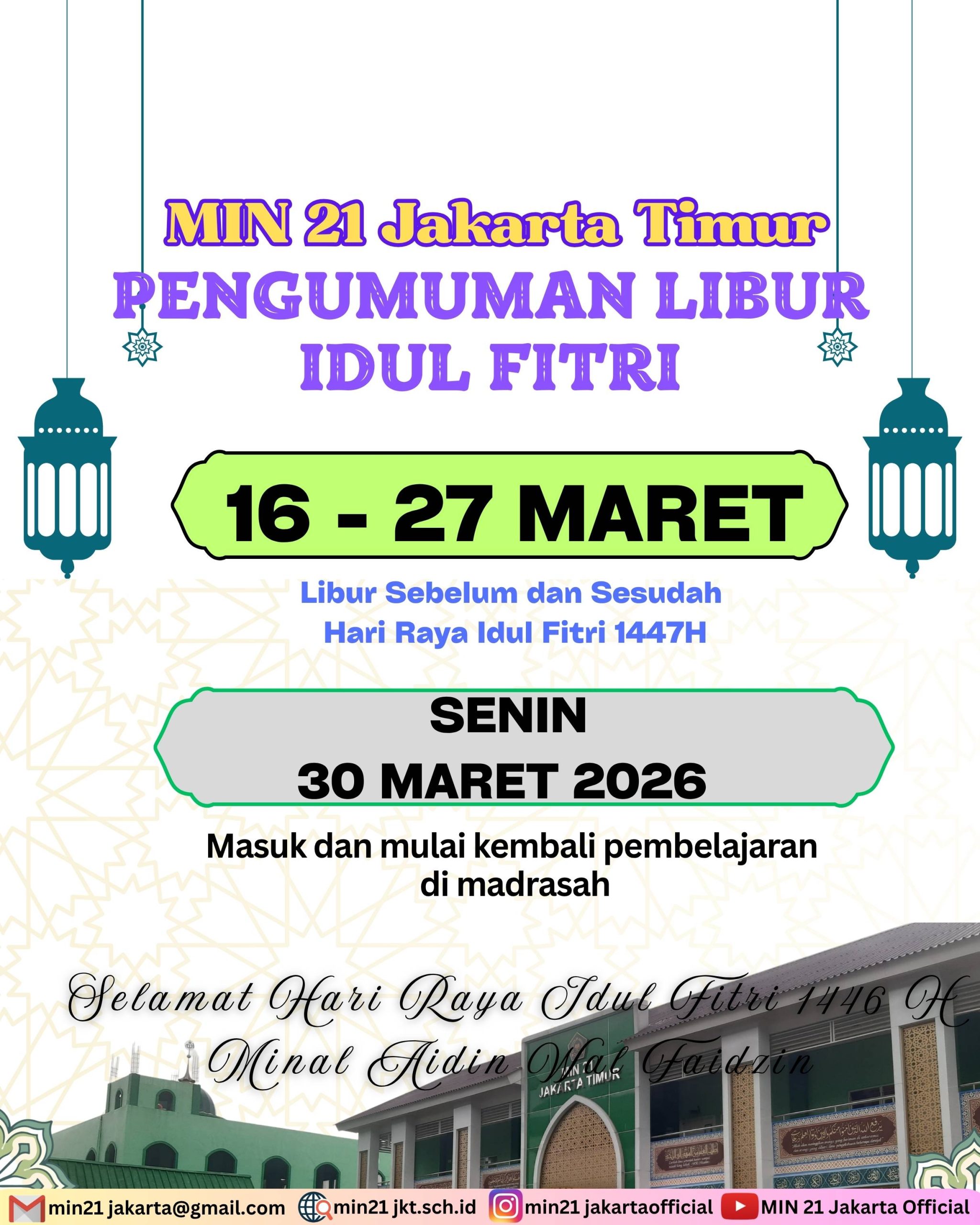 Libur sebelum dan sesudah Hari Raya Idul Fitri 1447 H mulai tanggal 16 s.d 27 Maret 2026;