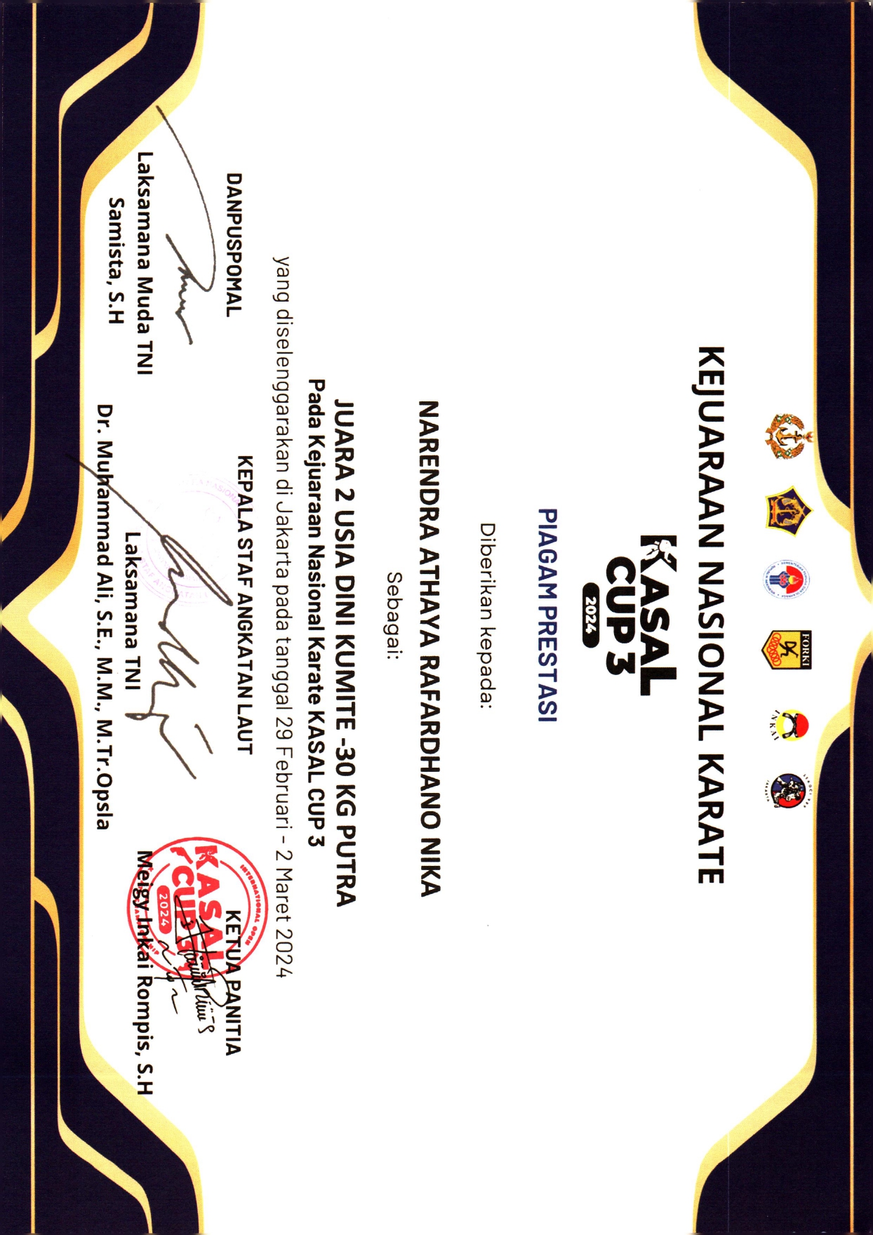 NARENDRA ATHAYA RAFARDHANO NIKA berhasil meraih Juara 2 Usia Dini Kumite -30 Kg Putra pada Kejuaraan Nasional Karate KASAL CUP 3 Tingkat Nasional tanggal 29 Februari – 2 Maret 2024