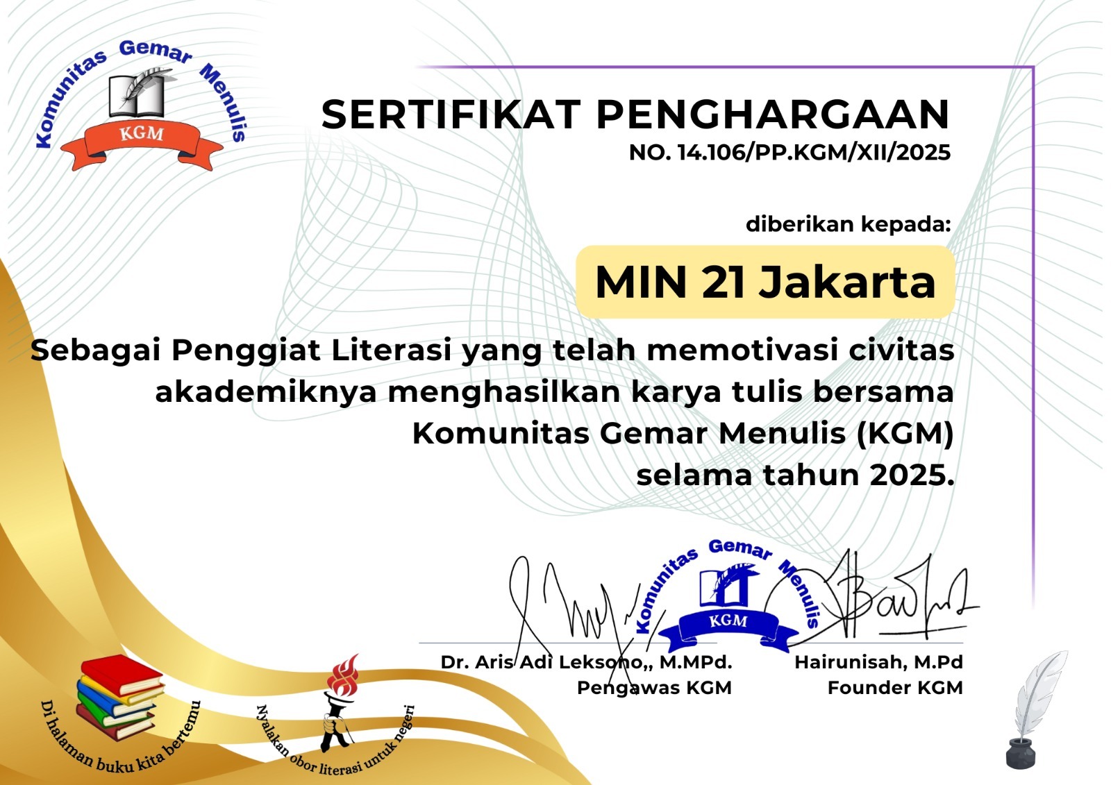 Penghargaan diberikan kepada MIN 21 Jakarta Sebagai Penggiat Literasi yang memotivasi civitas akademik menghasilkan karya tulis bersama tahun 2025